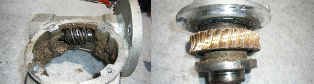 A második példánál a csigahajtás egyik szimeringjét a savas közeg tönkretette, az olaj pedig elszivárgott. A képeken jól kivehető, hogy kenés hiányában a puhább fémből készült bronzkoszorút az acél csigaorsó ledarálta. Ebben az esetben sajnos a hajtómű nem javítható gazdaságosan, cserére szorul.